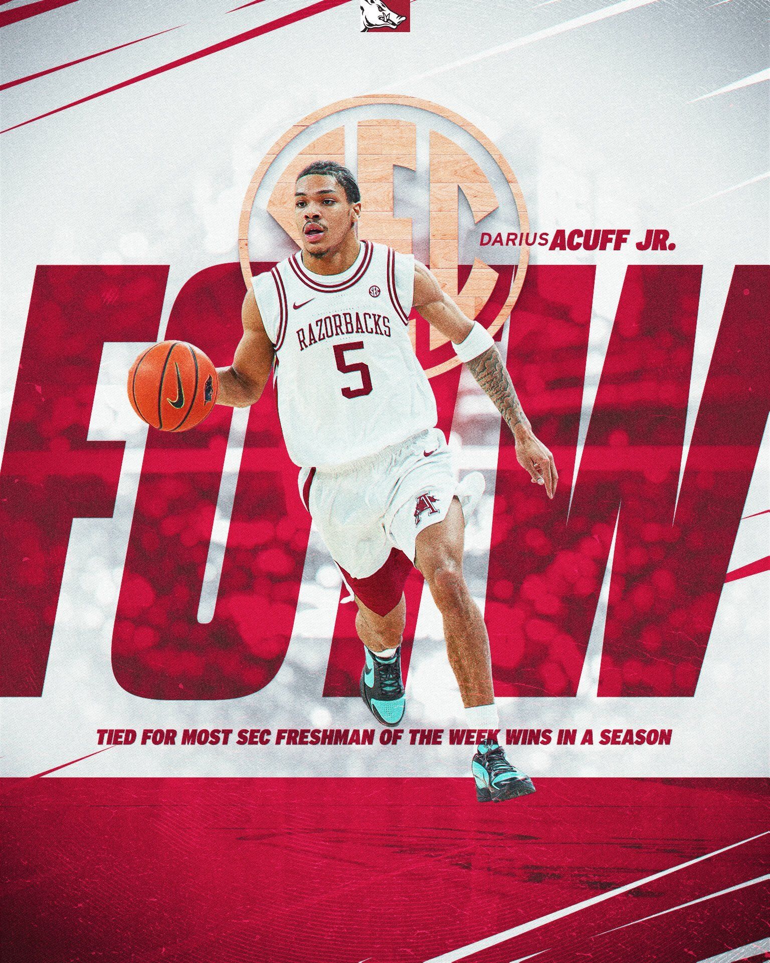 🔺 Rare Feat. Razorback men’s basketball’s Darius Acuff Jr. earned his sixth SEC Freshman of the Week award this season! He becomes one of six players ever to accomplish this feat. Acuff averaged 24 points and 5.5 assists in Razorback wins over No. 15 Vanderbilt and LSU. He became the seventh Razorback freshman ever to score at least 30 points when he scored 31 against LSU.