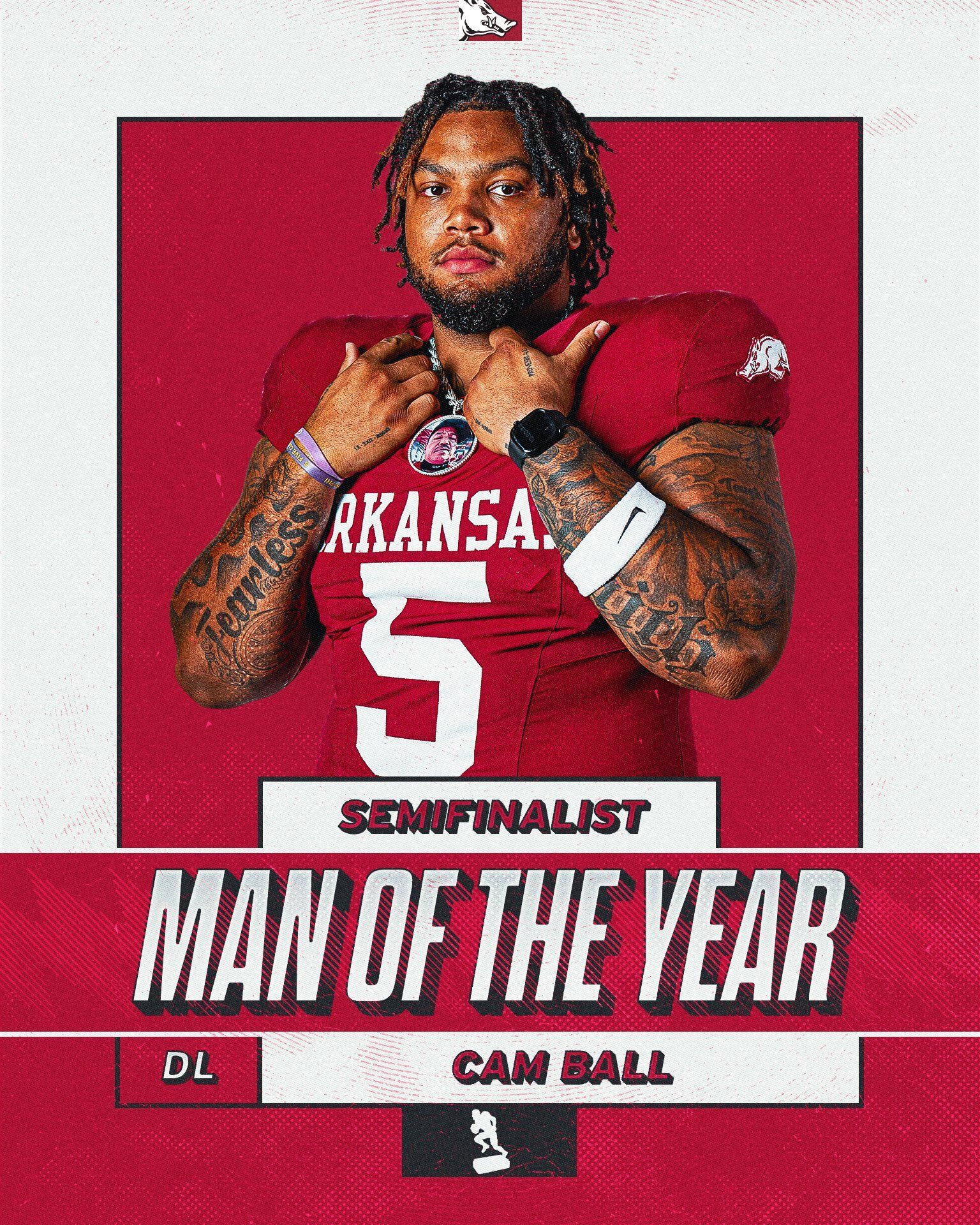 🔺 He’s The Man. Arkansas defensive lineman Cam Ball has been named a semifinalist for the 2025 Jason Witten Collegiate Man of the Year Award, recognizing his leadership on and off the field. He has been involved in over 120 events and founded his own non-profit.