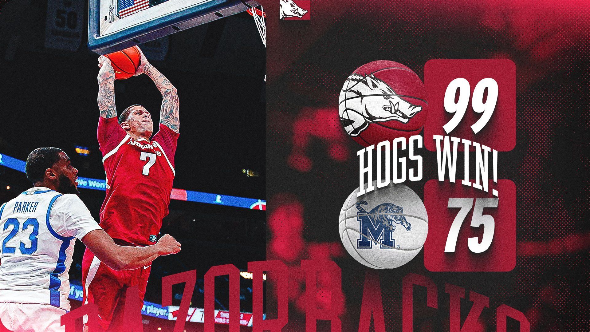 🔺 Road Hogs. Razorback men’s basketball defeated Memphis 99-75 at the FedEx Forum last night! Freshman Meleek Thomas led all scorers with 23 points, adding seven rebounds and four steals. Fellow freshman Darius Acuff Jr. scored 17 with seven assists. The Hogs turn to the regular season, which begins Monday at Bud Walton Arena.