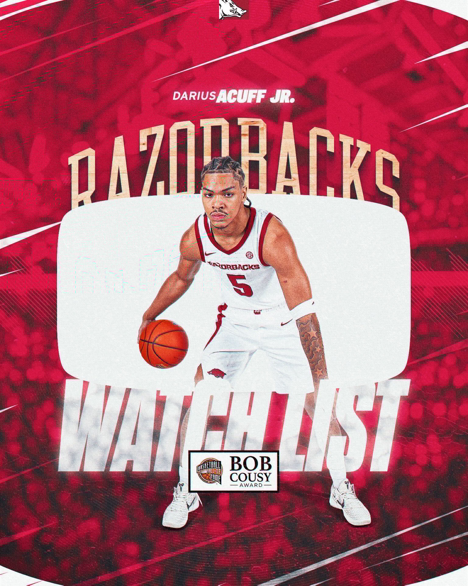 🔺 Running Point. Arkansas men’s basketball freshman Darius Acuff Jr. is one of 20 players nominated for the 2026 Bob Cousy Award, recognizing the nation’s top point guard. Acuff, a highly-rated recruit, received numerous accolades in high school, including being named the top-ranked point guard by 247Sports and ESPN.
