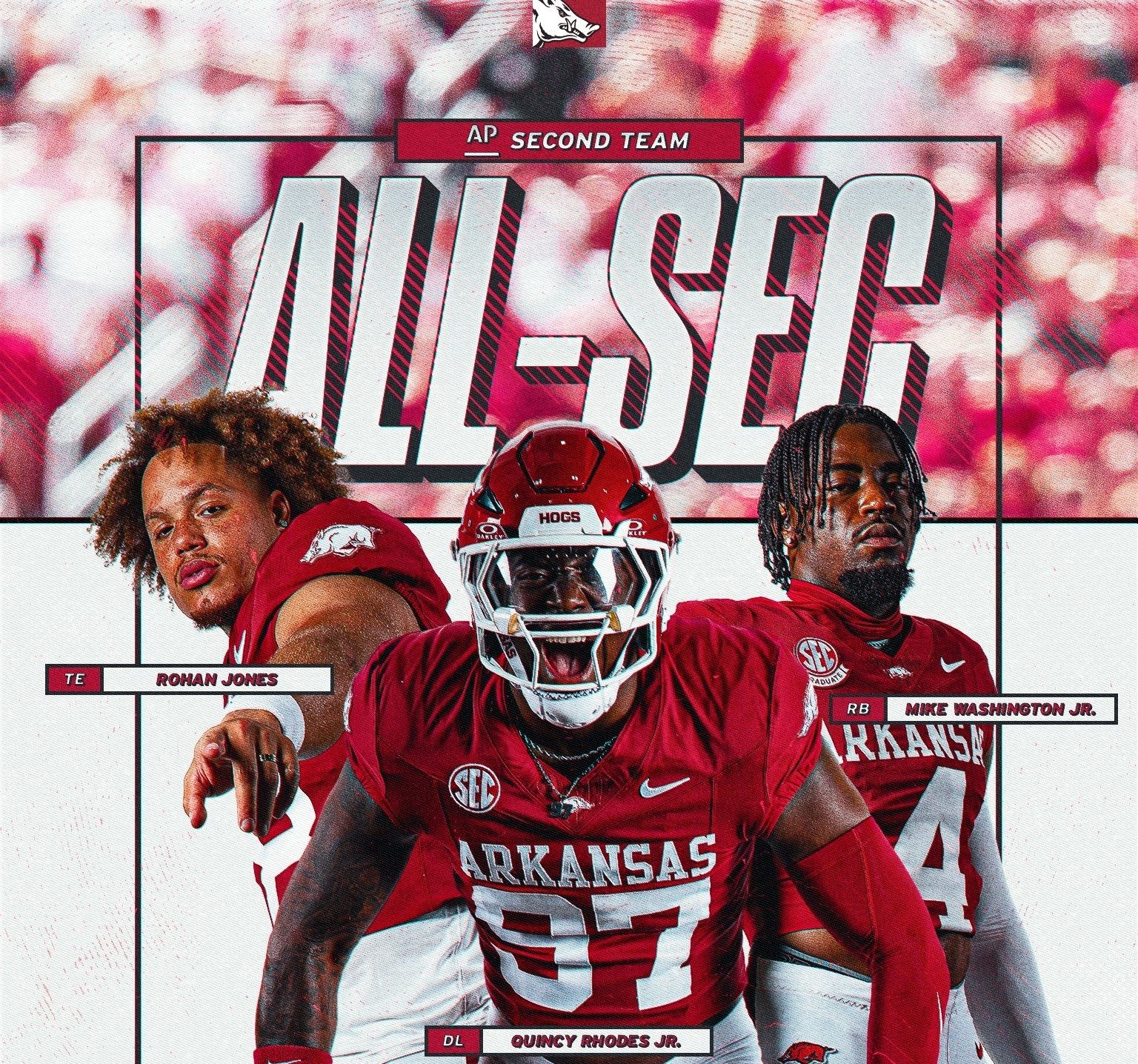 🔺 Triple Take. Arkansas placed three players on the 2025 Associated Press All-SEC teams: Rohan Jones, Quincy Rhodes Jr., and Mike Washington Jr. All three earned second-team recognition. Jones led Arkansas in receiving yards, Rhodes Jr. led the team in tackles for loss, and Washington Jr. achieved a 1,000+ yard rushing season.