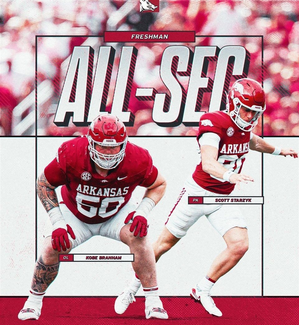 🔺 Rockin’ Rookies. Arkansas placed two players on the Freshman All-SEC team — offensive lineman Kobe Branham and kicker Scott Starzyk. Both made significant contributions to the team’s success in 2025. This marks the fifth time in the last six years that Arkansas has placed multiple players on the freshman team.