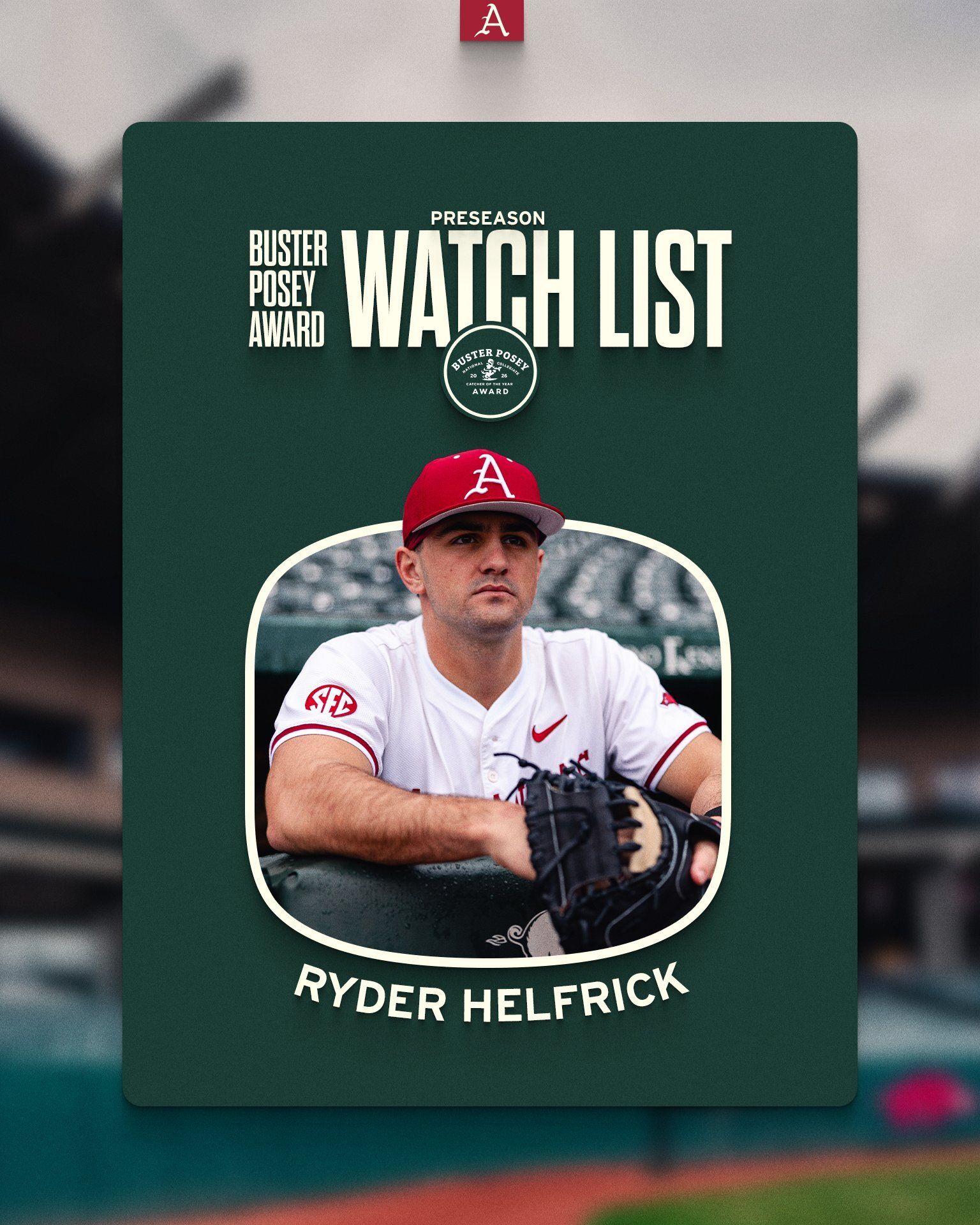 🔺 Catching Eyes. Razorback catcher Ryder Helfrick has been named to the preseason watch list for the Buster Posey National Collegiate Catcher of the Year Award. Helfrick, a preseason All-American, had an impressive 2025 season, leading Arkansas to the College World Series and playing exceptionally both offensively and defensively.