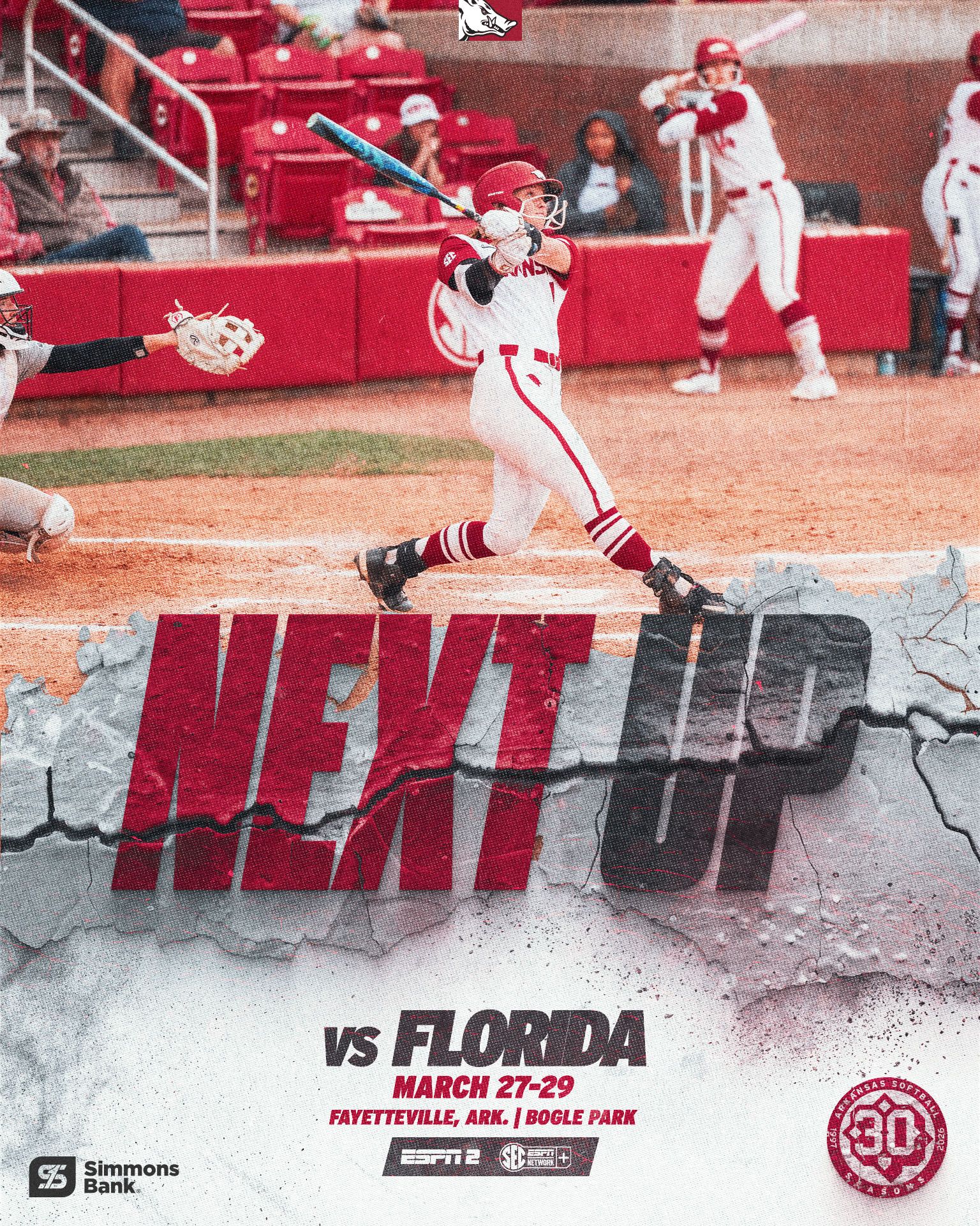 🔺 Top-10 Series. No. 9 Arkansas softball hosts No. 3 Florida for a top-10 SEC series this weekend. Tonight’s 6 p.m. game will be broadcast on ESPN2. The series continues tomorrow at 7 p.m. and concludes on Sunday at 1 p.m., with both games streaming on SEC Network+.