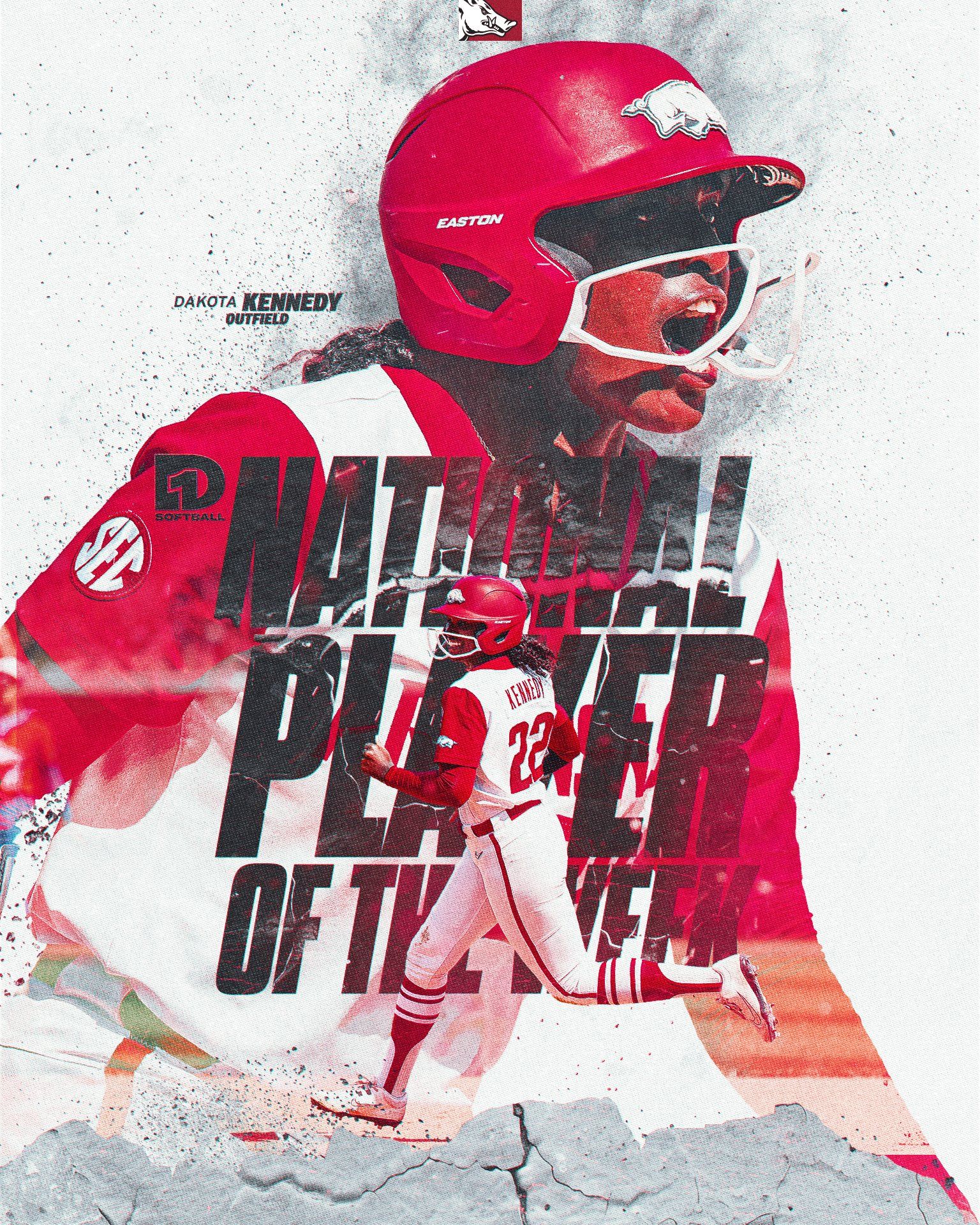 🔺 Nation On Notice. Arkansas softball outfielder Dakota Kennedy was named D1Softball National Player of the Week after a standout performance, including a walk-off home run against No. 3 Florida. Kennedy batted .462 with six hits, two doubles, two home runs, and seven RBI during the week.
