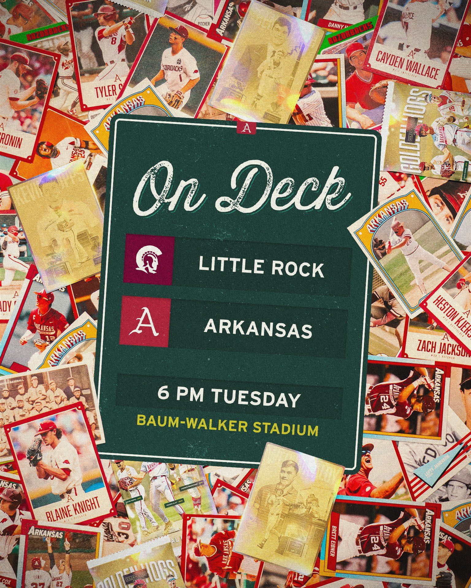 🔺 In-State Showdown. No. 22 Arkansas baseball returns home to face Little Rock tonight at 6 p.m. on SEC Network+. Arkansas is 6-2 in midweek games this season and will start Tate McGuire. The Razorbacks hold a 30-6 overall record against in-state opponents since 1947.