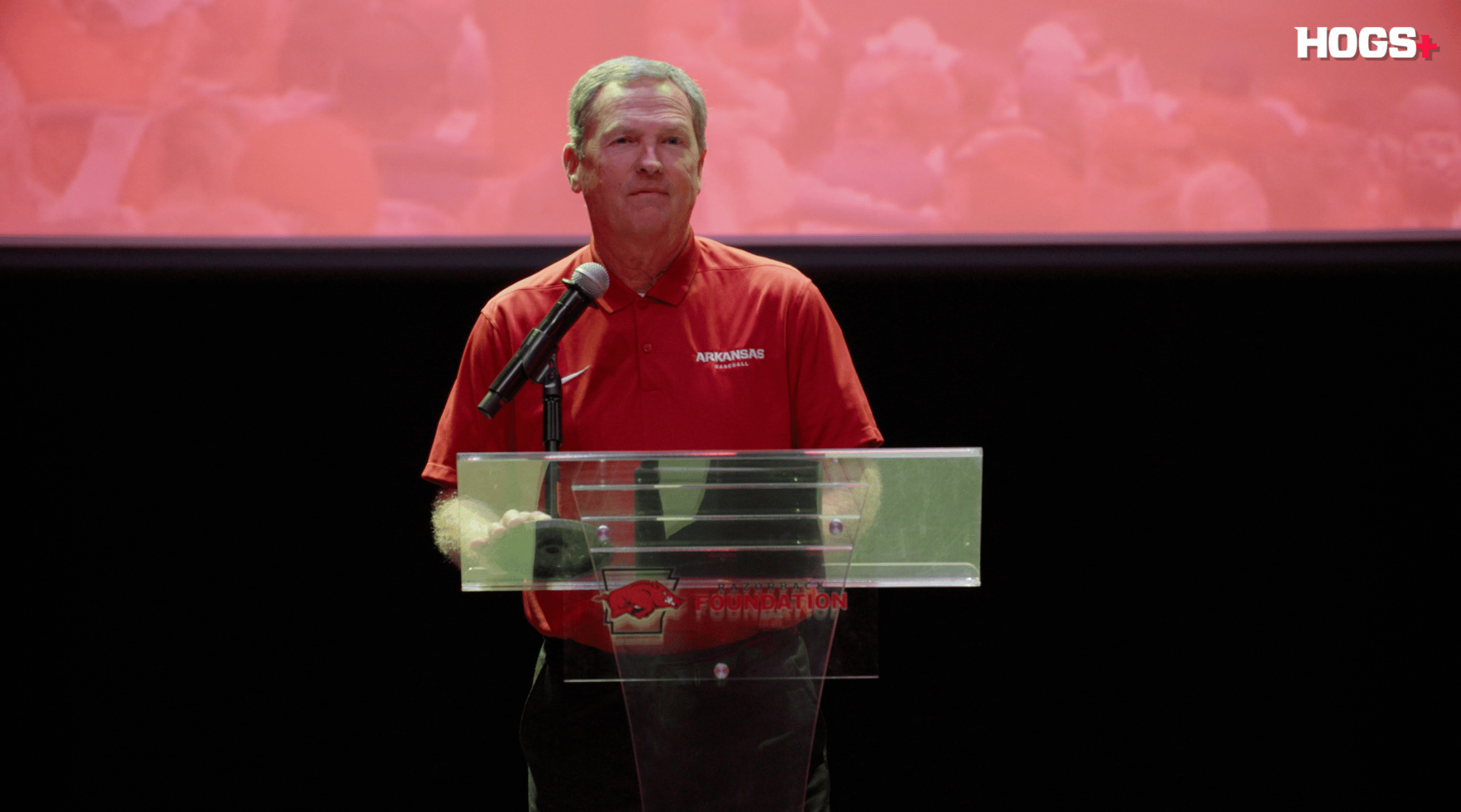 Arkansas Baseball Head Coach Dave Van Horn speaks in front of the crowd at the Swatter's Club about the 19 games played in March, and previews upcoming matchups in April, including series against highly ranked Alabama and Georgia.